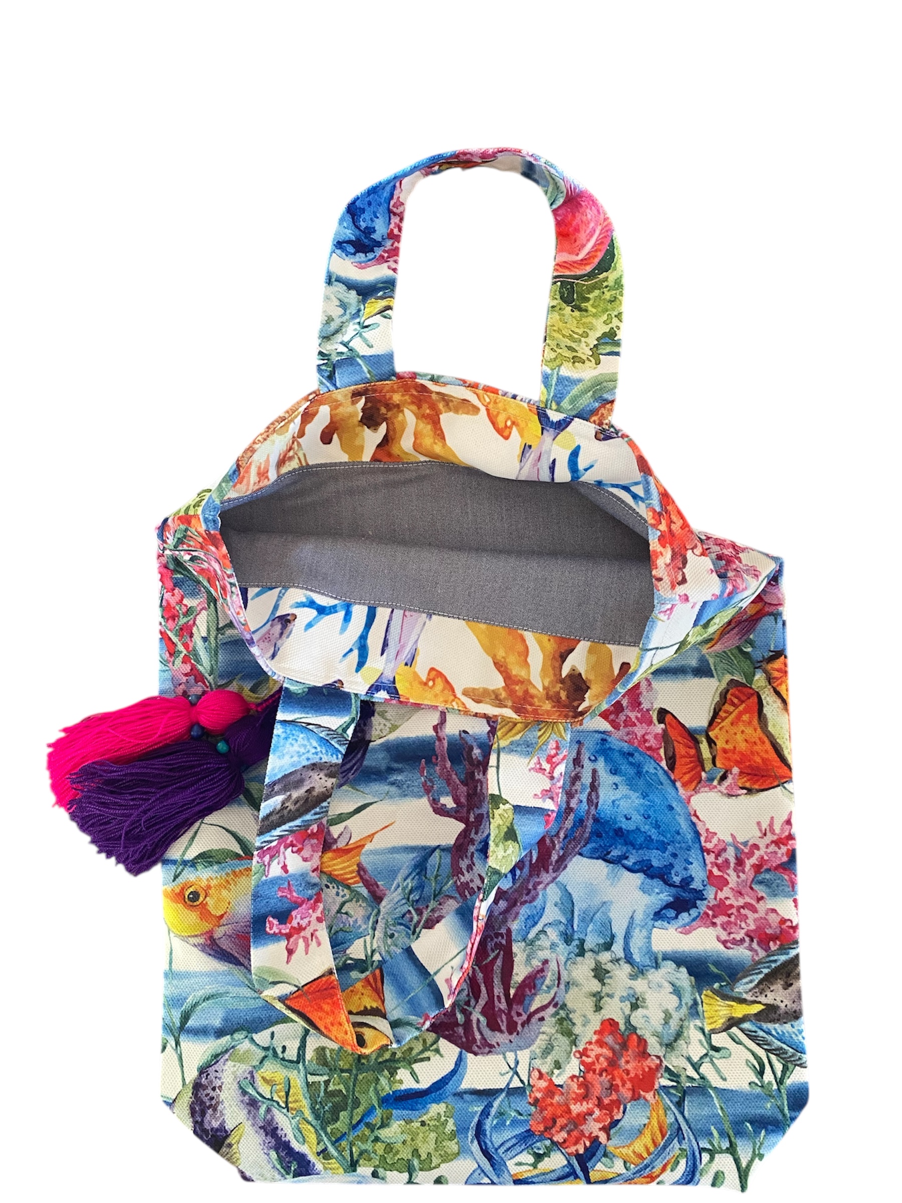 Puskuller ile suslenmis, okyanus esintili icimizi acan kumas dijital baski, yikanabilen ve ic astarli, gunluk cok amacli canta.