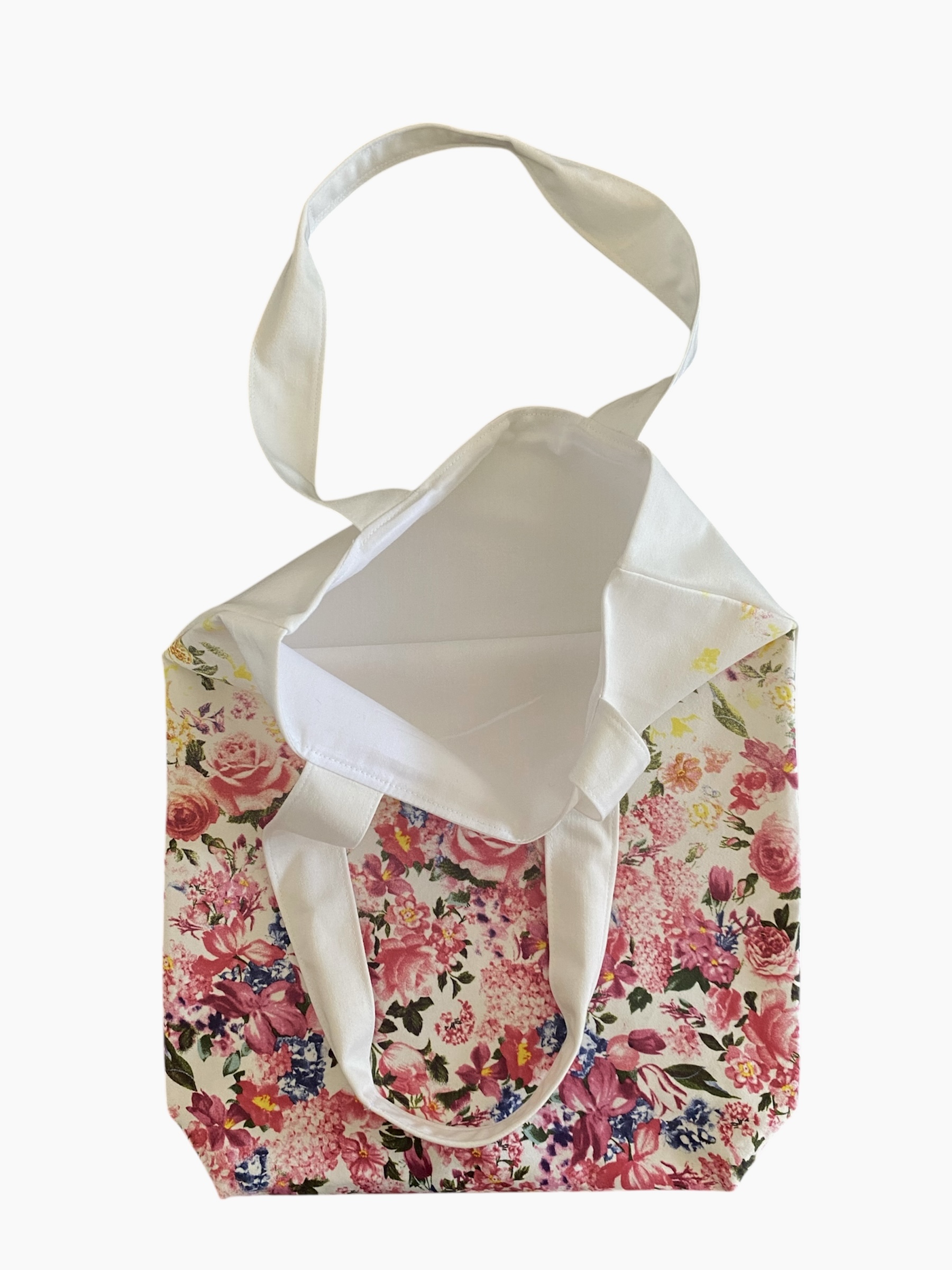 Guller ve bahar cicekleri ile bezeli baskili kumas cantanin ici astarli, yikanabilir ve utulenebilir. Gunluk cok amacli kullanim icin uygundur.