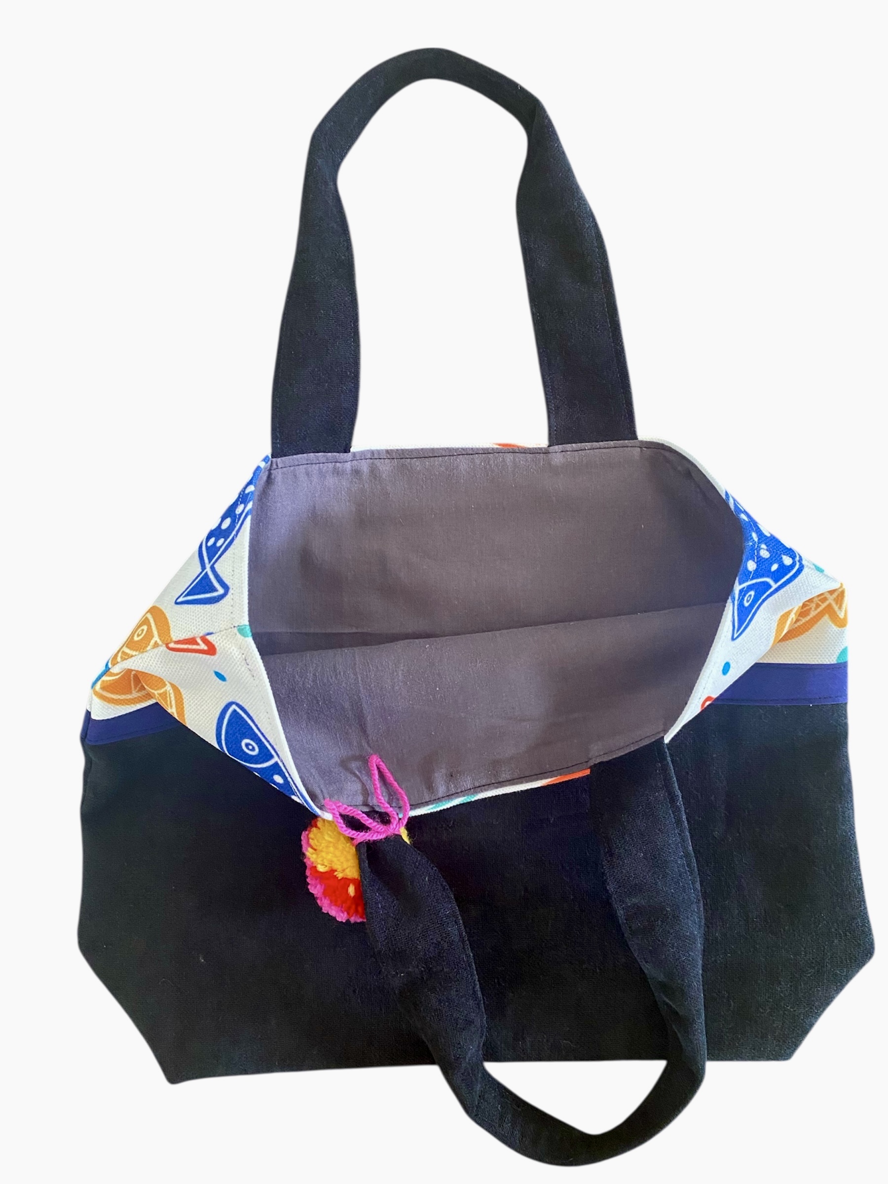Bardur olarak kullanimis balik desenli kumas dijital baskidir. Siyah kadife kumas canta, ici astarli, yikanabilir. Gunluk kullanim icin uygundur.
