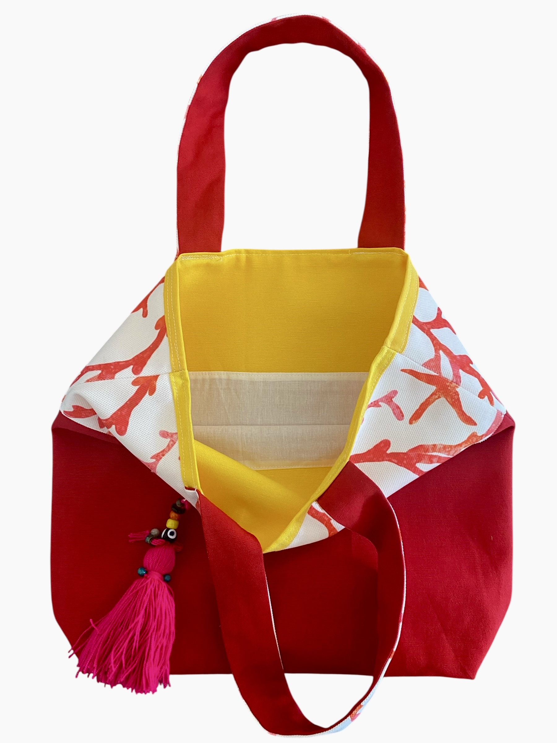 Puskul ile suslenmis, bordurlu dijital baski kumas, duck kumas ile tamamlanmis, ici astarli, yikanabilir cantadir.