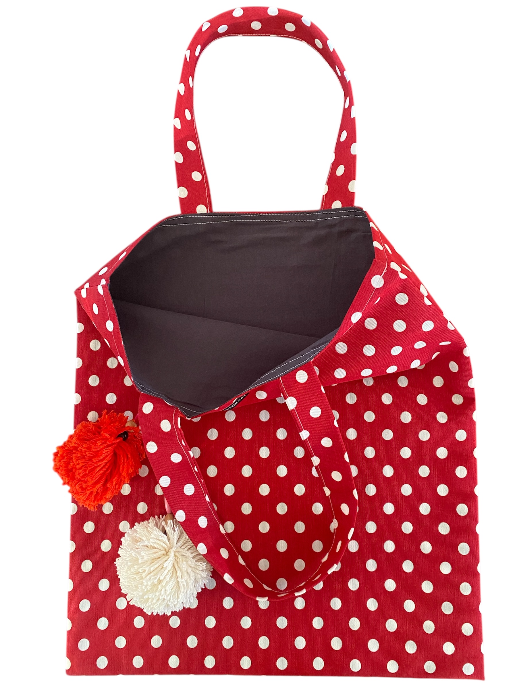 Puantiyeli duck kumas ile dikilmis, ponponlar ile suslenmis, ici astarli. yikanabilir canta. Gunluk cok amacli kullanima uygundur.