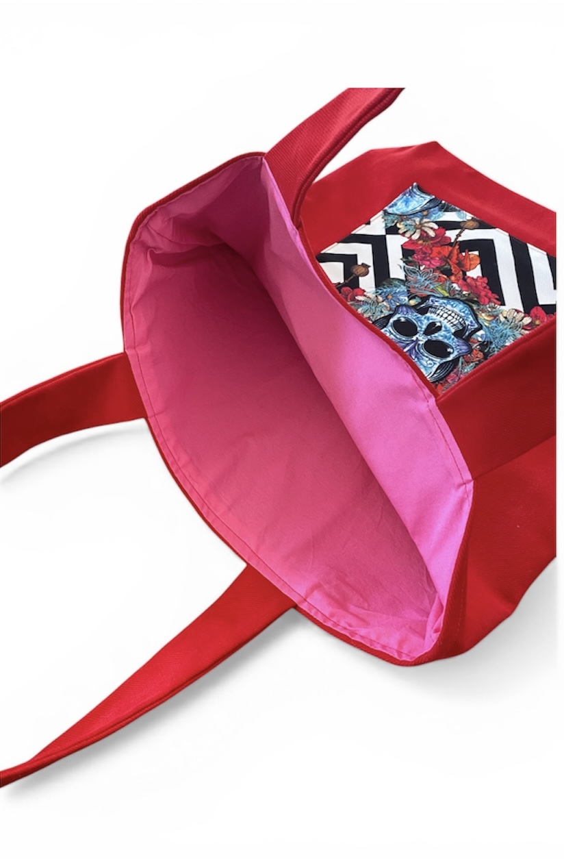 Kuru kafa deseni kirmizi canta uzerine dekupe edilmistir. Ici astarli, yikanabilir, gunluk cok amacli kullanim icin uygundur.